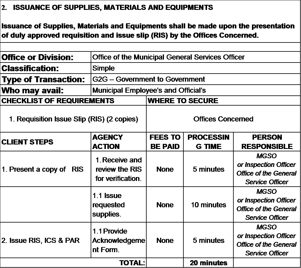 Exercise general supervision and control over programs and activities of the Municipal General Services Office; and carry out the effective delivery of general services such as procurement supplies, materials equipment (SME), drugs and medicine supplies and services inventory of properties, rent out of facilities to public and private entities, assign office space to local or public officials who by law are entitled to such space, building and ground maintenance as well as janitorial, security, landscaping, electrical, carpentry, sound system, perform all functions pertaining to supply and property management and other related services.