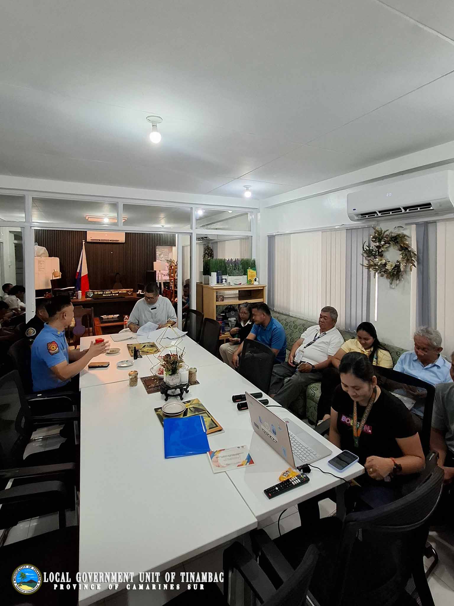 The Local Government Unit of Tinambac, under the leadership of Mayor Edward Albert โ€œBobitโ€ P. Prades, conducted a Municipal Disaster Risk Reduction and Management (MDRRM) Meeting spearheaded by Mr. Romil Estolano, LDRRMO III. The meeting primarily focused on the presentation and approval of the Local Disaster Risk Reduction and Management Fund Investment Plan (LDRRMFIP) for Calendar Year 2026. Discussions also highlighted the assessment of the municipalityโ€™s disaster preparedness, updating of contingency plans, and strengthening coordination among concerned offices to ensure effective and timely response during calamities and emergencies.