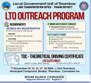 An LTO Outreach Program sarong programang hatod kan Lokal na Gobyerno kan Banwaan nin Tinambac sa lindong kan bagong administrasyon ni Mayor Edward Albert “Bobit” P. Prades sa pakikipagtabangan kan Land Transportation Office na pinamamayohan ni Regional Director Edgar Allan B. Castillejos sirin man kan LTO Tigaon District Office.