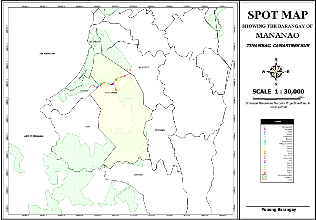 Mananao means overlooking, a place overlooking the San Miguel Bay, six (6) kilometers away from the town proper of Tinambac, Camarines Sur. It is bounded by Cawayan River on the east, Catigsan River on the west, on the north is swampy area and on the south is the mountainous part nearby barangay Canayona. It has a land area of 15,359.5 hectares. Background: towards the end of eighteenth century, this mountainous and hilly place was occupied by Julian San Andres and his clan. His son Julian was married to Gregoria Donacao. His two daughters were married to Emmanuel Diaz and Cesar Abelinde, another on Amos was born to his second wife and Cristina to his third wife.
