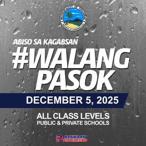 Due to the expected moderate to heavy rainfall (Yellow Rainfall Warning) in Camarines Sur from tomorrow noon until evening due to the combined effects of Tropical Depression “Wilma” and the shear line, as indicated in PAGASA Weather Advisory No. 4, classes at all levels–public and private–are hereby suspended in the Municipality of Tinambac on Friday, December 5, 2025.