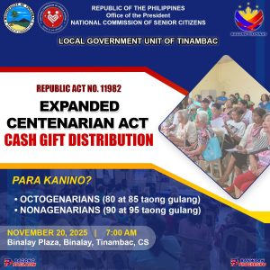 The Local Government Unit of Tinambac is pleased to announce the Expanded Centenarian Act (RA 11982) Cash Gift Distribution for senior citizens who have reached the milestone ages of 80, 85, 90, and 95 years old.