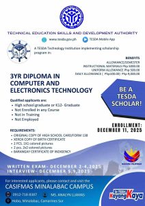 TESDA is offering a 3-Year Diploma in Computer and Electronics Technology with allowances and full scholarship benefits for qualified applicants.