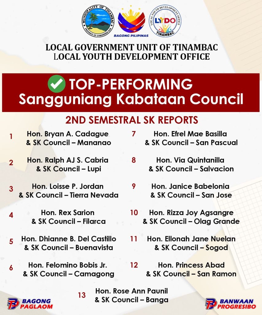 The Local Government Unit of Tinambac, through the Local Youth Development Office (LYDO), proudly recognizes the Top-Performing Sangguniang Kabataan Councils for their outstanding compliance, transparency, and dedication in the submission of their 2nd Semestral SK Reports.